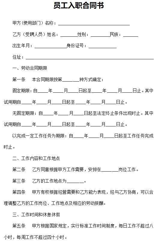第五条 甲方根据国家规定,实行标准工作时间制度,每日工作不超过八小时,每周工作不超过四十小时。