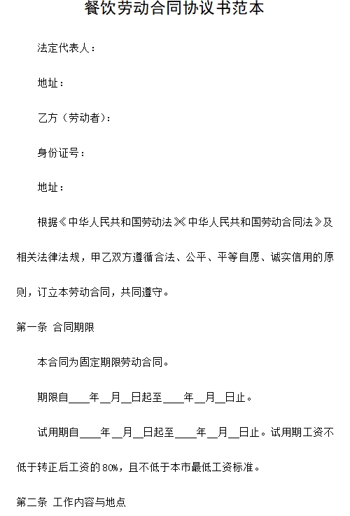 餐饮劳动合同协议书范本